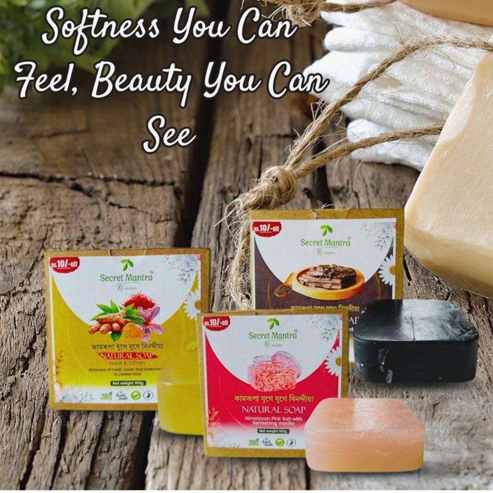 VARIETY PACK: Three distinct soap variants offering unique benefits – Haldi Zafran for traditional care, Pink Salt with Vanilla for gentle exfoliation, and Charcoal with Mint for deep cleansing